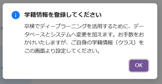 首題の件につきまして、システムの改修に伴い今後の利用時は自身の学籍情報(クラスなどの情報)を紐付ける必要があります。 ご面倒をおかけいたしますが、皆様のご協力のほどよろしくお願いいたします。