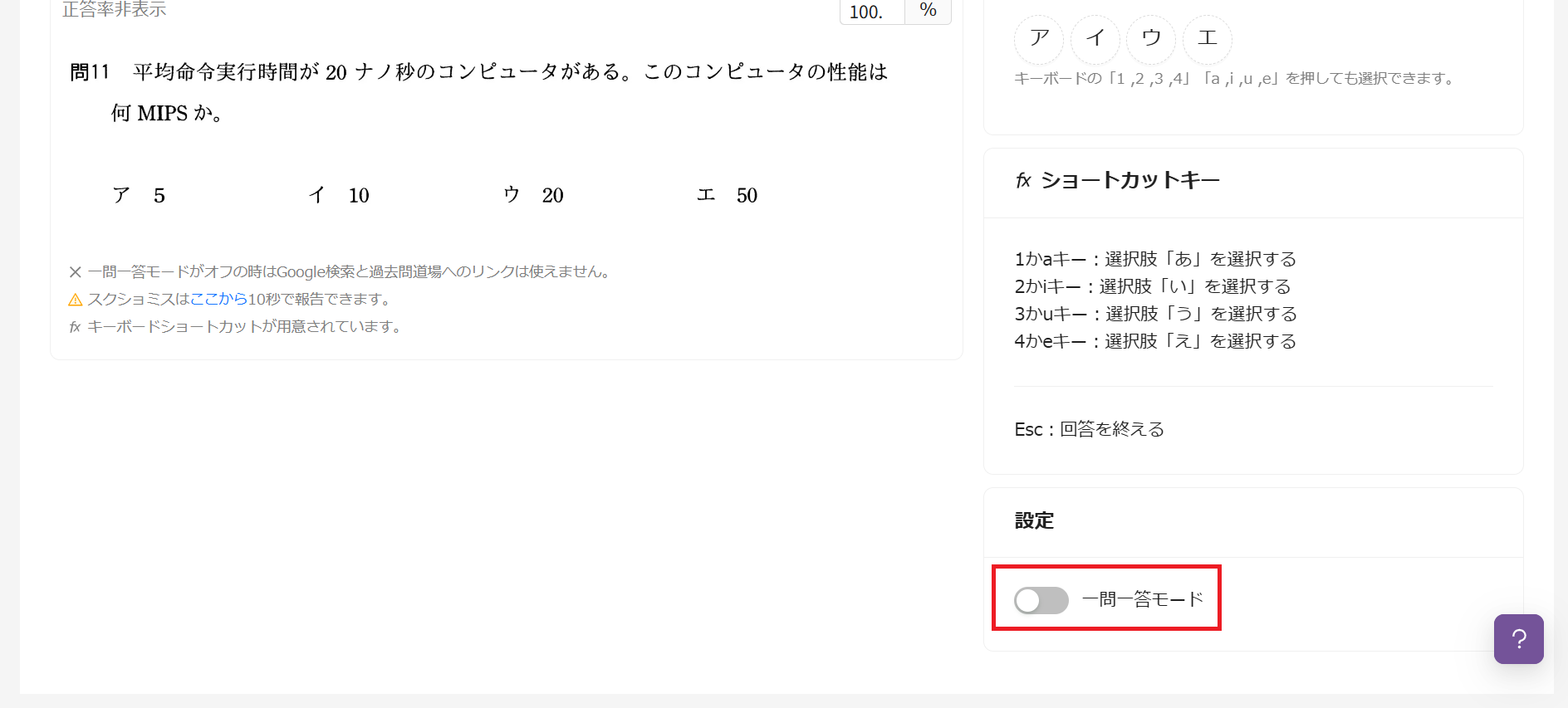 画面内の右下にある設定より「一問一答モード」をオンにしてください。