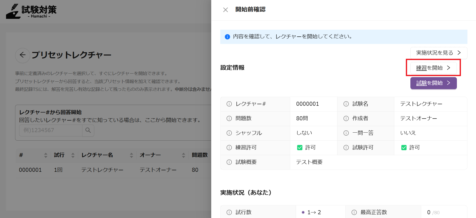 一度解答した問題集や、先生から教えてもらった問題集については、「模試」形式ではなく「練習」として解答することも可能です。