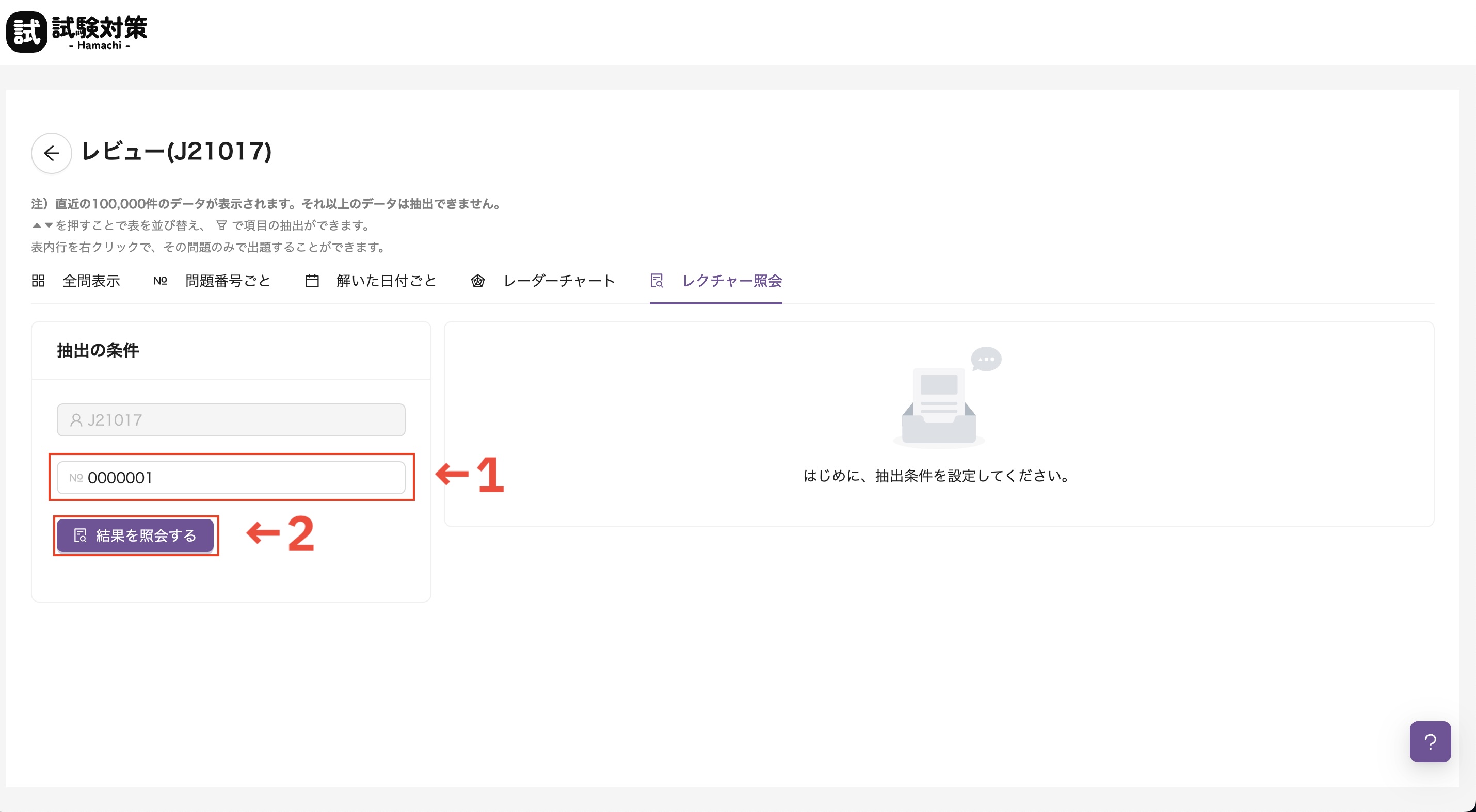 まずは、どの問題集の結果を見るのか「問題集ID(下図1)」を指定する必要があります。