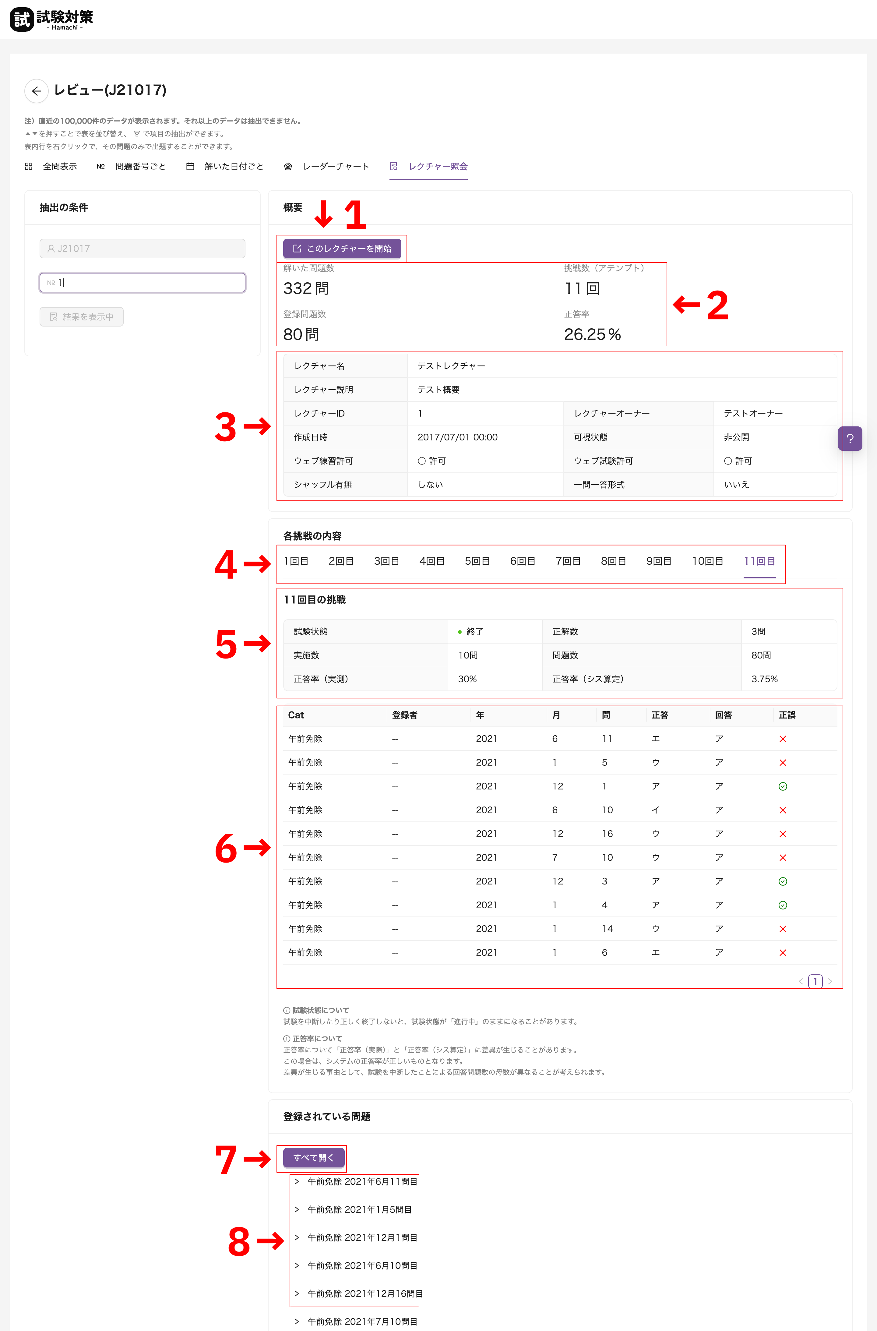 | 【5】アテンプトの詳細 | アテンプト毎の詳細(回答数や正答率など)が表示されます。 |