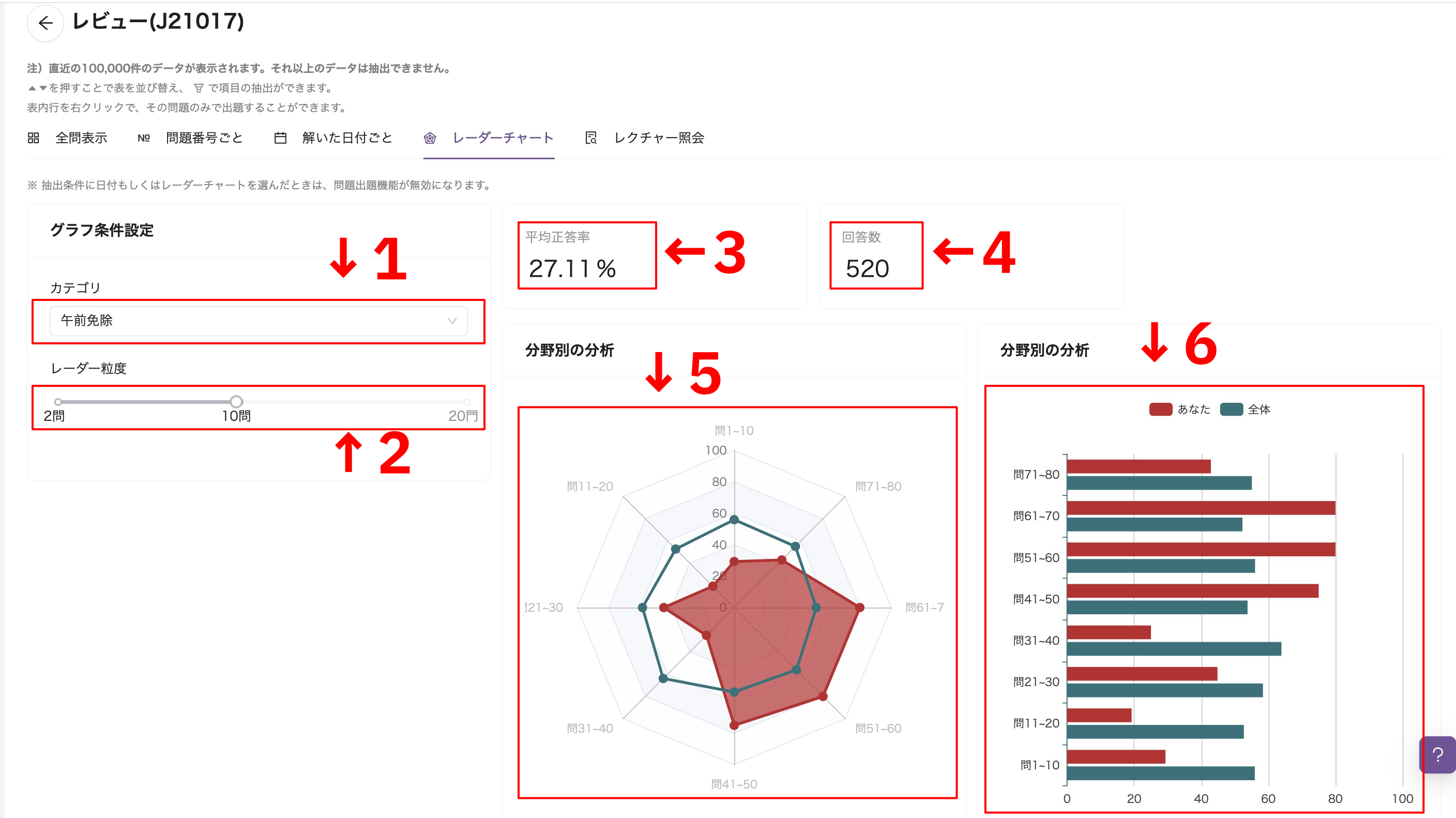 問題番号毎に、正答率をプロットしたレーダーチャートを確認できます。