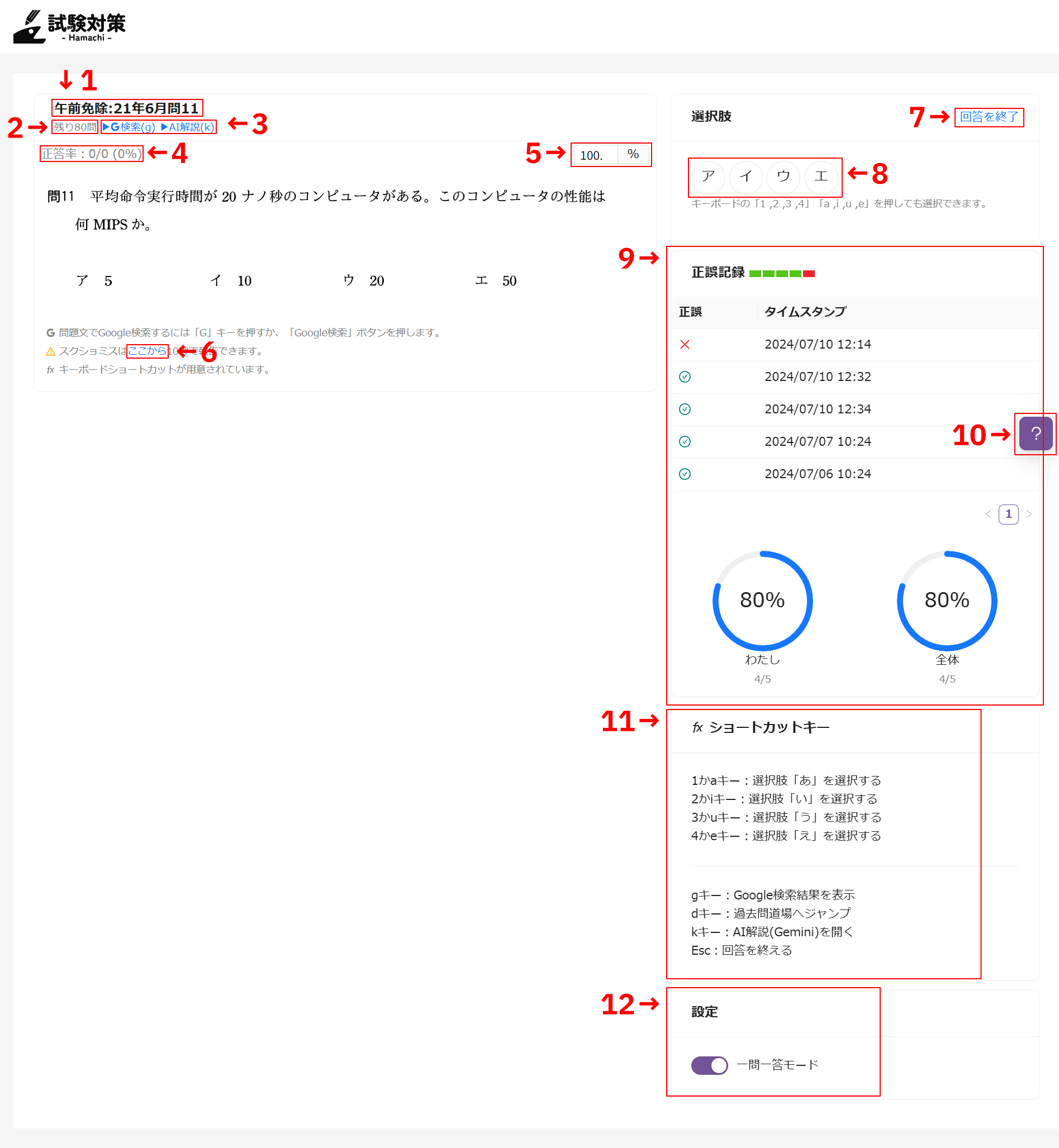 | 【9】過去実施ログ | あなたの過去の実施記録です。 全体の正答率と併せて表示されます。 |