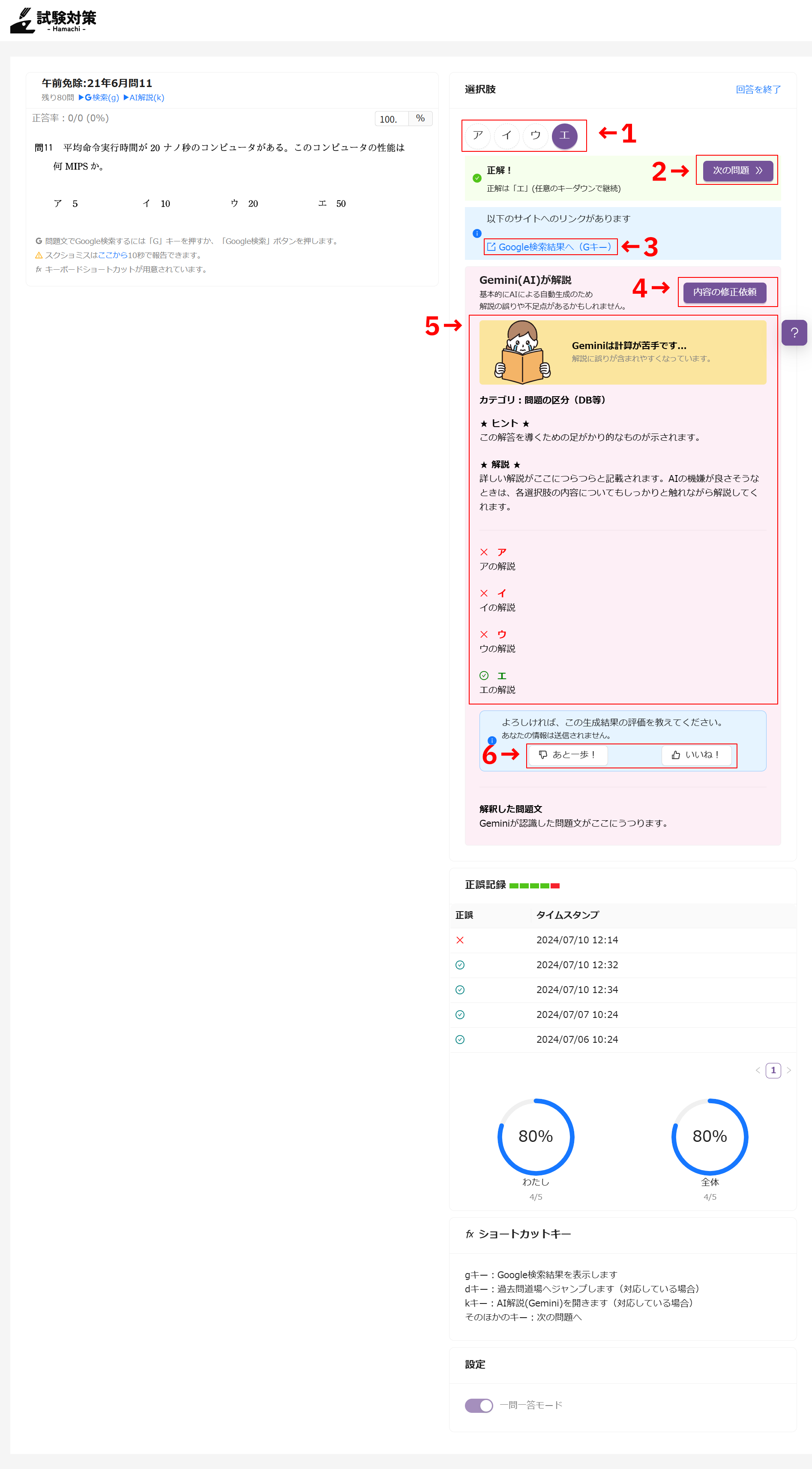| 【4】正答率 | 現状の正答率が表示されます。分子が正解数、分母が出題数です。 |