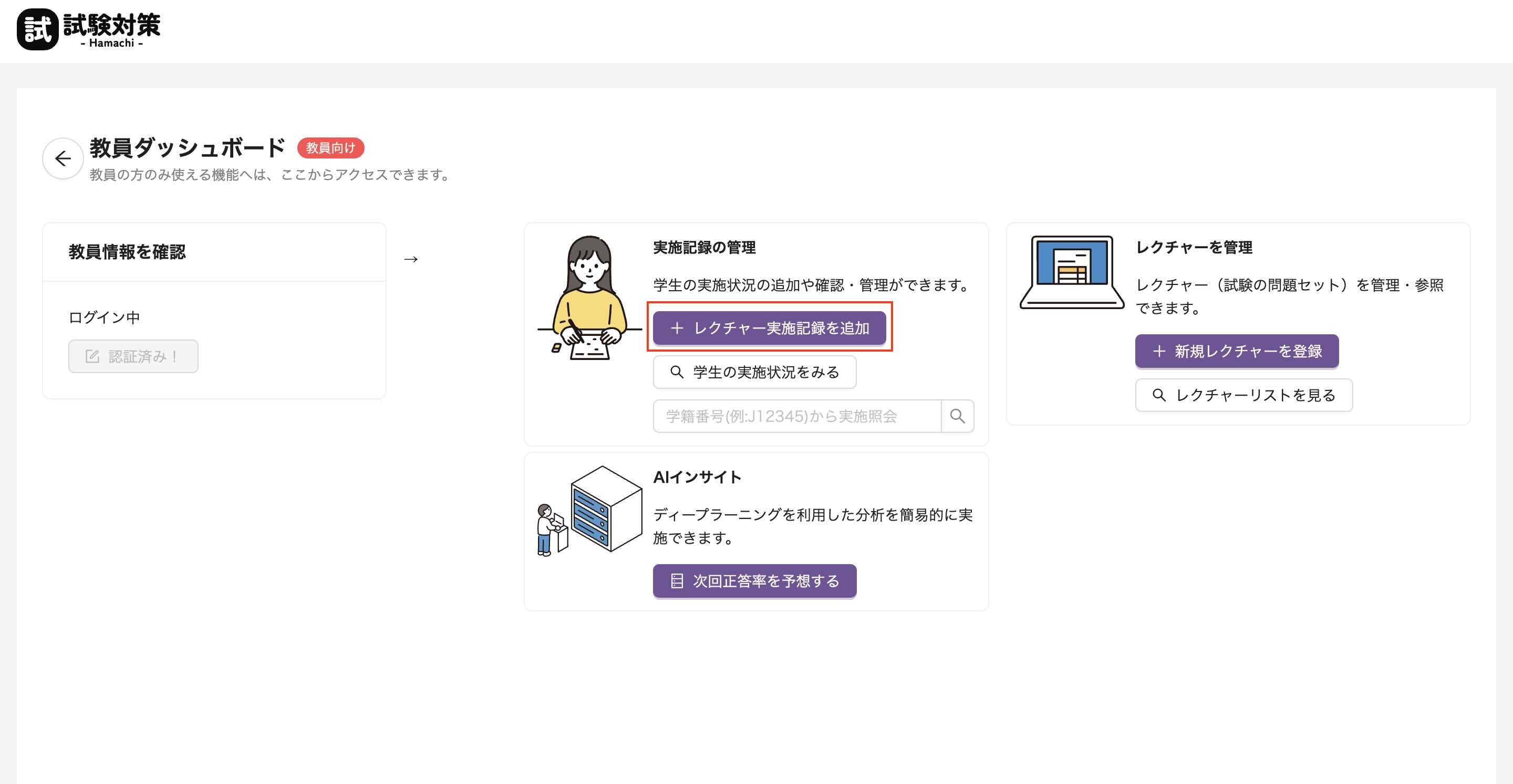 まずは、教員向けダッシュボードから「問題集実施記録を追加」をクリックして、採点画面を開きます。