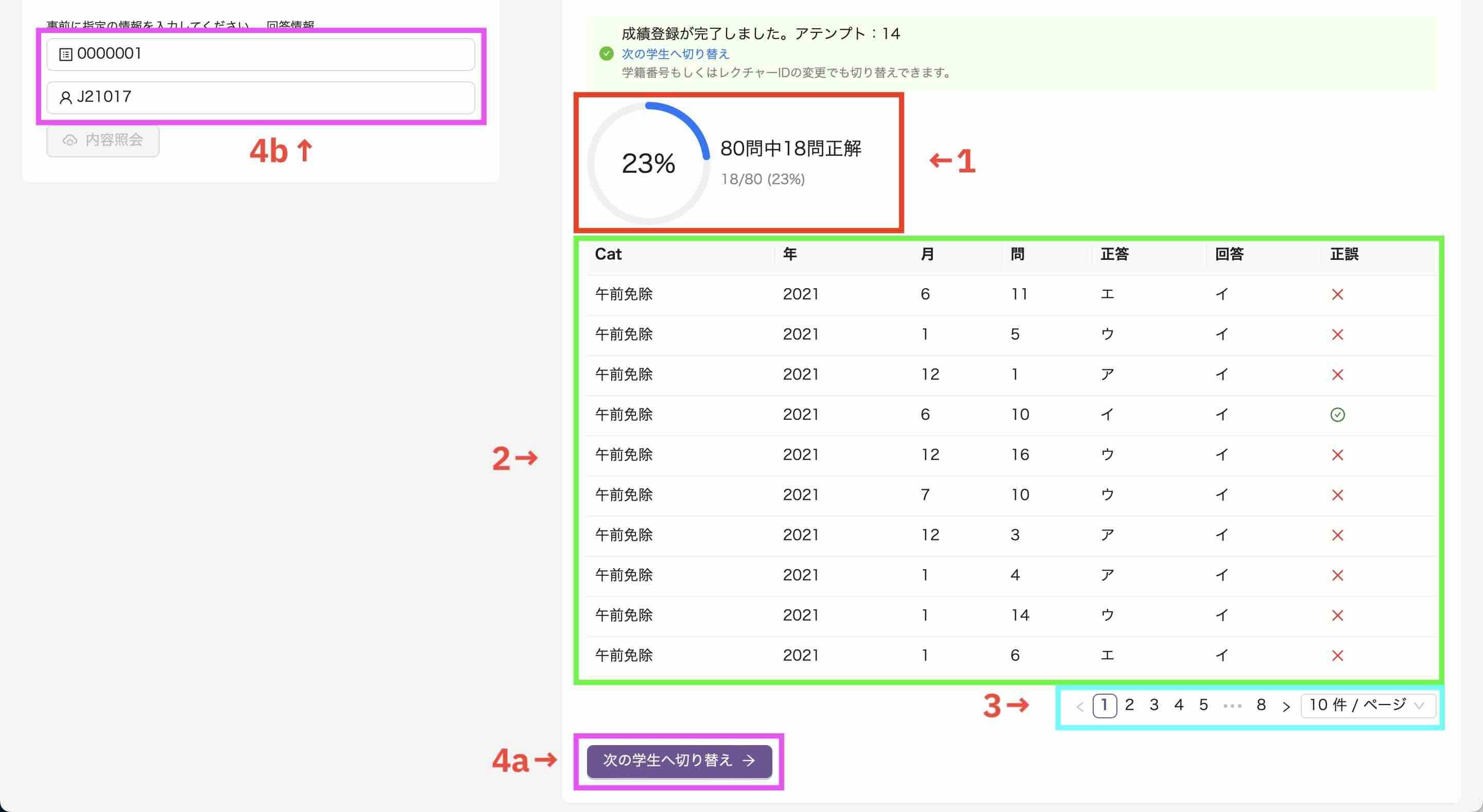 次の学生の採点や、他問題集の実施記録を追加するには、「次の学生へ切り替え」ボタン(上図4a)を押すか、上図4bの入力欄のいずれかを編集してください。