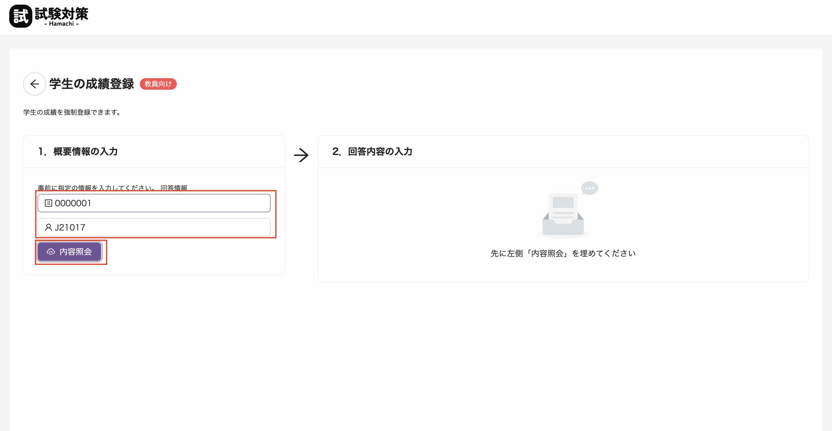 入力を終えたら、「内容照会」ボタンをクリックして、成績を入力するための入力欄を呼び出します。