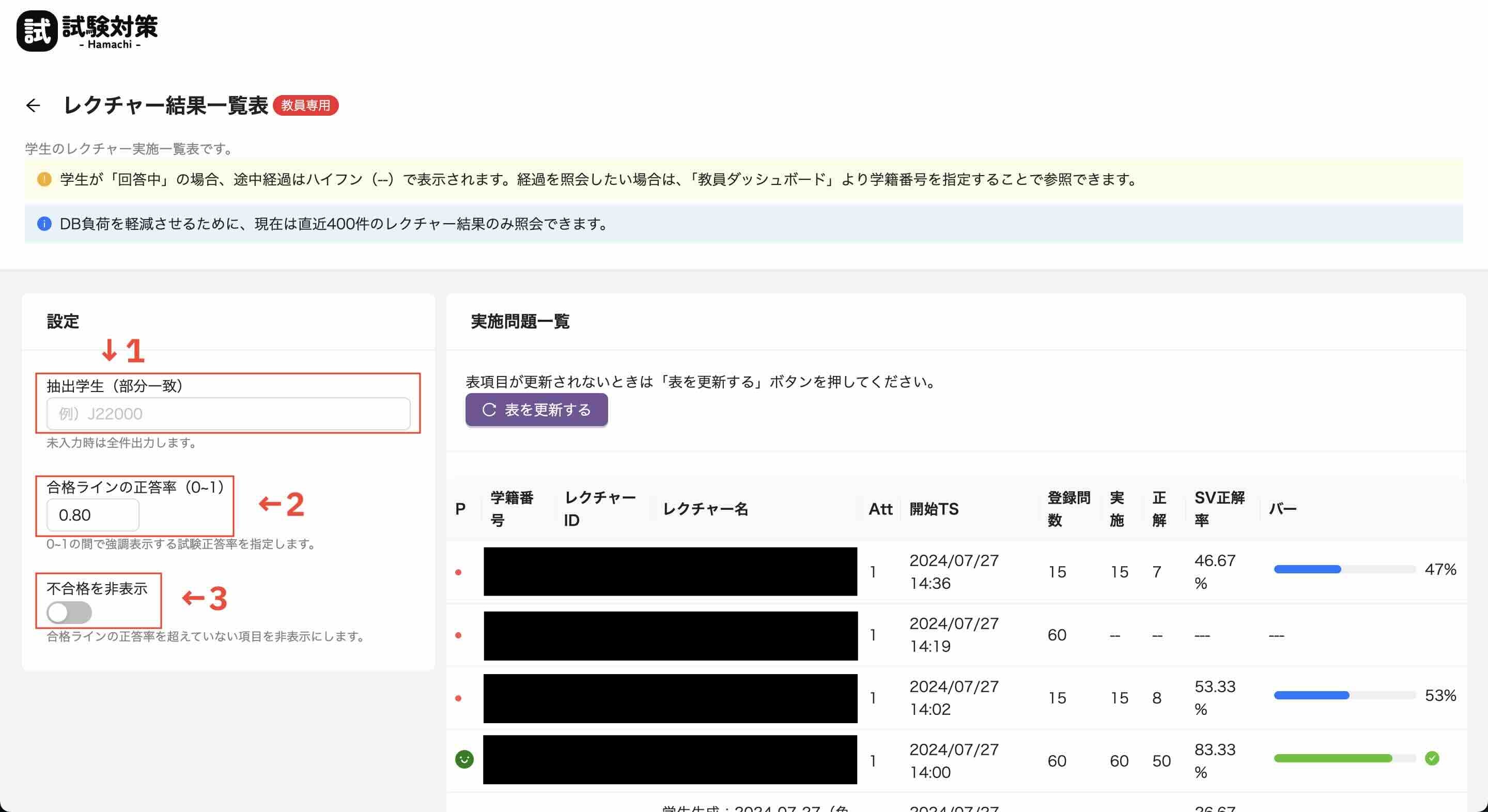 | 【3】 不合格を非表示 | 問題集結果が合格ラインを下回る場合、その行を非表示にします。 |