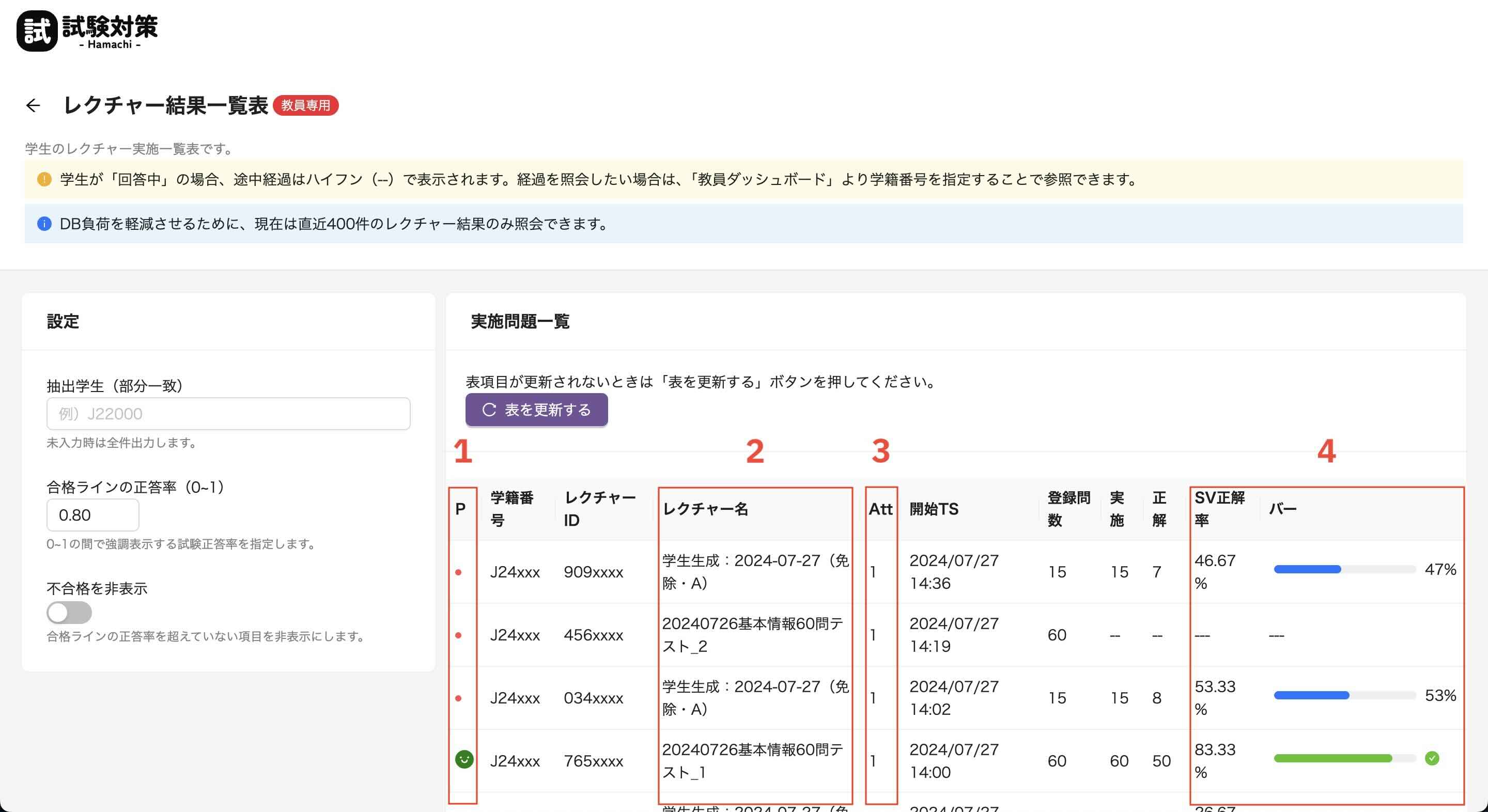 参照画面には、学生の問題集への取り組みが一覧表示されます。